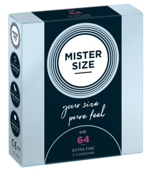 Muž/žena si může vybrat správnou velikost kondomu pro penis pomocí přední strany obalu, protože uprostřed je široká, tmavě modrá měřicí stupnice. Velikost 64 je vhodná pro obvod penisu 14,5 až 15,5 cm.