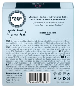 Padne jako druhá kůže – pro ještě VÍCE pocitu! Průhledné, extrémně tenké kondomy Mister Size (64 mm) vyrobené z přírodního kaučukového latexu. Kondomy jsou potaženy lubrikantem a mají savičku na konci. Veganské.