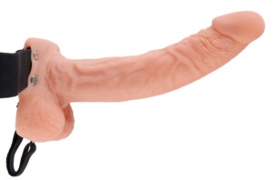 Realistický dutý strap-on dildo s velkými varlaty a elastickým popruhem. Lze ho nosit na penisu pro větší délku a obvod nebo použít pro žhavé peggingové hračky.