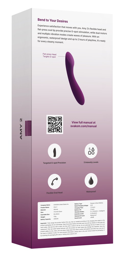 Vibrátor Amy 2 od SVAKOM má úžasně ergonomický zakřivený tvar a zploštělou špičku, která je ideální pro bodovou stimulaci v těle i na něm. Flexibilní silikonový vibrátor je sametově měkký, což znamená, že se velmi snadno drží a téměř sám klouže po kůži a do intimních hlubin. To znamená, že lehký, ale intenzivní vibrátor lze snadno začlenit do sólové nebo párové zábavy.
