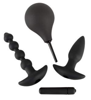 Sada obsahuje kolík, anální kuličky a intimní sprchu. Součástí sady je vibrátor, který lze pro extra zábavu zasunout do kolíku nebo análních kuliček! Kolík cca 15 cm dlouhý, Ø 2,1 až 3,5 cm, korálky cca 18 cm dlouhé, Ø 1,2 až 3 cm, intimní sprcha cca 17 cm dlouhá, trubice sprchy cca 5,5 cm dlouhá, Ø 6 až 9 mm. Materiál: silikon, ABS, PVC. Baterie prosím objednávejte zvlášť: 1 x AAA.