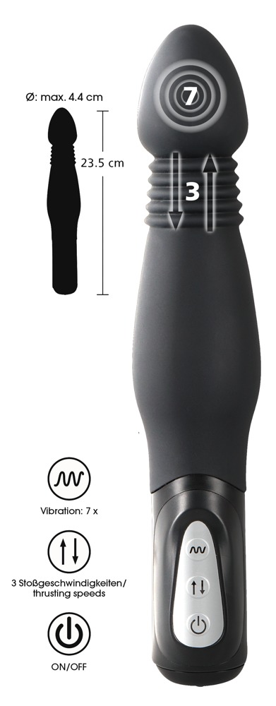 Anální vibrátor má kuželovitý hrot a vypouklou dřík. Má také 7 vibračních režimů a 3 rychlosti tahání, které lze ovládat samostatně. Černý.