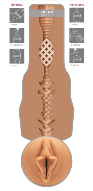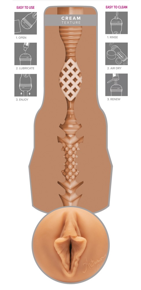 Snadno uchopitelný masturbátor Autumn Falls Cream od Fleshlight v diskrétním perleťovém pouzdře. Vaginální otvor návleku je originální replikou vagíny erotické hvězdy Autumn Fall. Různé textury s různými průměry uvnitř rozkošného kanálku se velmi podobají Autumnině těsné vagíně a jsou ideální pro intenzivní orgasmickou masáž během masturbace. Vnitřní návlek je vyroben z velmi měkkého materiálu podobného pokožce. Vedle otvoru je také Autumnův podpis. Pouzdro má také ochranné víčko. Návlek lze z pouzdra vyjmout pro čištění.