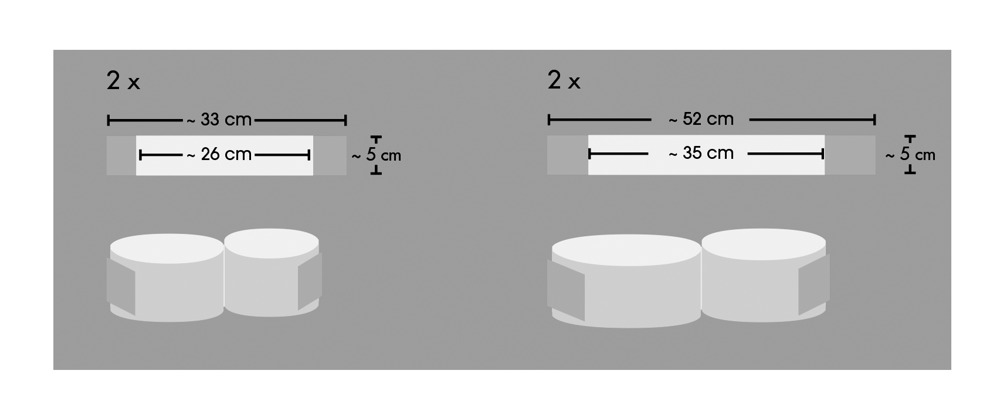 Všechna pouta mají dvojitý popruh: 35 – 52 cm dlouhý nebo 26 – 33 cm dlouhý, 5 cm široký. Černá. Polypropylen.