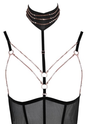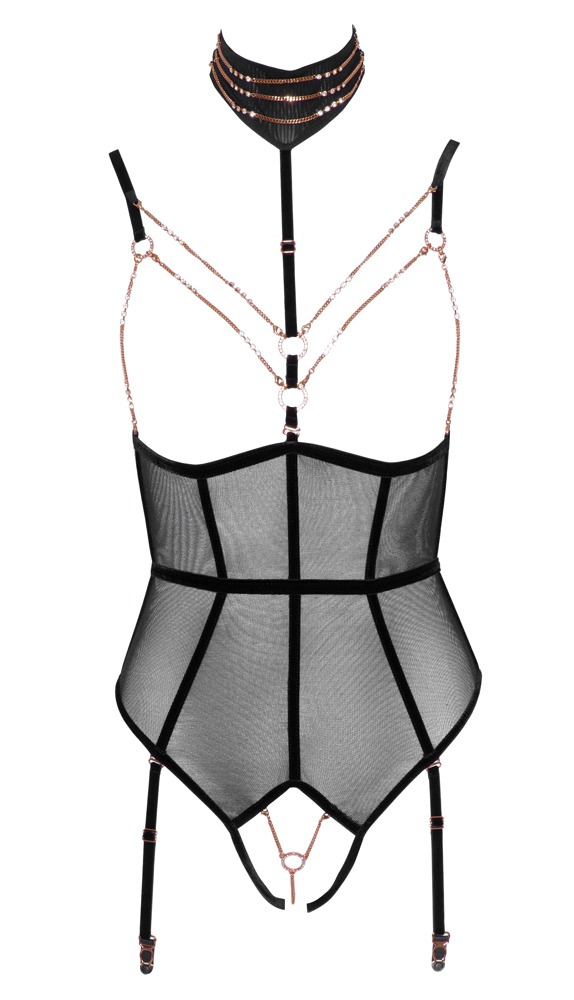 Body s otevřenými košíčky a technologií powernet od Abierta Fiena s kompletně otevřeným rozkrokem, elastickými sametovými ramínky a růžovo-zlatými ozdobami. Podprsenka i podvazková ramínka jsou nastavitelná. Podvazková ramínka lze odejmout. Podprsenka má nastavitelný výstřih a náhrdelník (s knoflíkem vzadu) s ozdobnými řetízky. Náhrdelník i náhrdelník jsou také odnímatelné. Malé řetízky v oblasti výstřihu s karabinkami a řetízek v oblasti rozkroku s ozdobným kroužkem jsou také odnímatelné. Zadní část body je dvoudílná. Na podprsence jsou dvě spony a pas je tvořen páskem na kalhotky/podvazky.