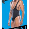 Přiléhavé černé body ze stringu od Svenjoyment má dlouhé rukávy. Je v provokativním stylu, protože je vyrobeno z neprůhledného matného materiálu s průhlednými vsadkami Powernet. Je měkké a pružné pro velmi pohodlné nošení. Vpředu má velký výstřih s kroužky. Body má také stojáček a zip na hrudi. Na kapse je také polstrovaný zip.