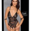 Body bez ramínek a rozkroku od Cottelli BONDAGE v ušlechtilém černém matném vzhledu. Dodává se s odnímatelným postrojem v červeném matném vzhledu se stříbrnými kovovými doplňky. Řetízky s karabinkami jsou odnímatelné od postroje, takže obojek, bederní pás a pouta lze nosit i samostatně. Obojek a bederní pás jsou nastavitelné pomocí druků, manžety na zápěstích pomocí suchého zipu. Stimulující řetízek vede skrz zcela otevřený rozkrok, který lze také sundat.