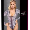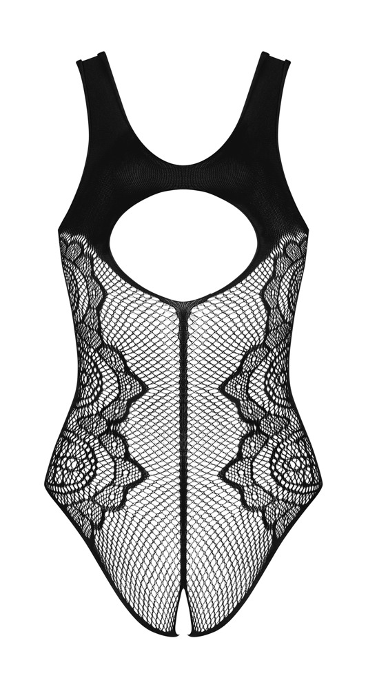 Černé, vysoce pružné body bez rozkroku B335 od Obsessive vyrobené z měkké, hedvábné síťoviny. Ozdoby vetkané do boků dokonale zdůrazňují křivky. Vzrušující přiléhavý střih s výstřihem vzadu a svůdně odhalujícím rozkrokem.
