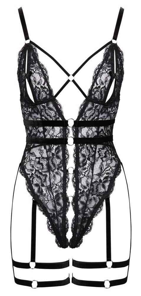 Černé body bez rozkroku od Cottelli LINGERIE s pružnými ramínky a stehenními pásky (vše lze sundat). Body je vyrobeno z měkké, pružné černé květinové krajky. Vpředu je zcela otevřené s ozdobnými stříbrnými kroužky, které vše drží pohromadě. Je také svůdně otevřené v rozkroku. Krajkové košíčky lze otevřít díky malým suchým háčkům. K dispozici jsou také stylová ramínka a kroužek v oblasti výstřihu. Kolem pasu jsou sladěná, nastavitelná, pružná sametová ramínka. Ramínka podprsenky a stehenní pásky jsou také vyrobeny z pružného sametu a lze je také nastavit. Ozdobu na stehnech a podvazky lze také sundat.