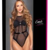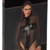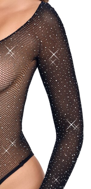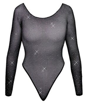 Černé body s dlouhým rukávem od Fantasy by Cottelli je vyrobeno z úchvatné průhledné síťoviny. Je pokryto třpytivými drahokamy různých velikostí. Je měkké, lehké a extrémně pružné pro maximální pohodlí. Má odhalující střih tanga a vysoký střih nohavic, který zdůrazňuje nohy a hýždě.