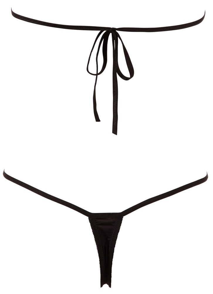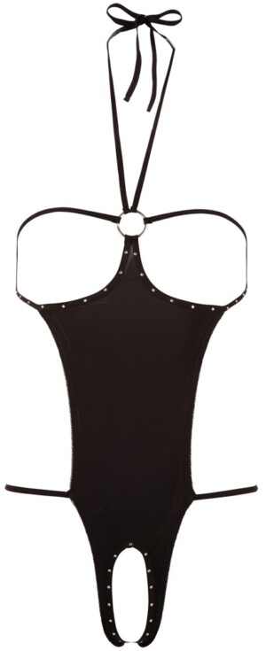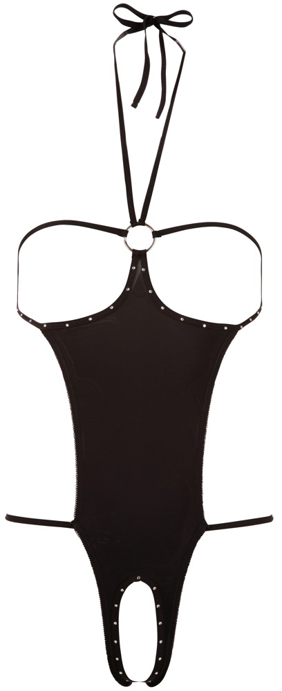 Sexy body s ramínky na ramínka a zavazováním. Otevřené košíčky a rozkrok zdobené kamínky. Vzadu jsou pouze ramínka. Černá. 85% polyamid, 15% spandex.