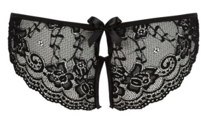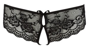 Tyto roztomilé kalhotky kombinují krásnou krajku s květinovým vzorem s výřezy vpředu a vzadu, které jsou zdobeny mašlemi. Svůdně otevřený rozkrok je zakryt pouze dvěma pružnými ramínky. Kalhotky jsou velmi pohodlné díky vysokému podílu spandexu a přiléhají k ženským křivkám.