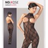 Černý kombinéz z měkké krajky se vzorem a hlubokým výstřihem na zádech. Otevřený rozkrok. S částí u nohou. 100% polyamid.