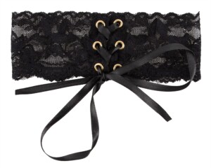 Krásný choker z černé krajky se 6 očky a saténovým šněrováním pro zavazování a nastavení délky. Šněrování lze nosit vpředu nebo vzadu.