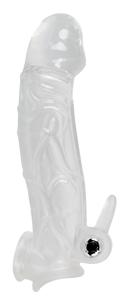 Průhledný návlek na penis, který dodává penisu větší tloušťku. S žilkami a návlekem na varlata a prodloužením cca 5 cm díky obrovskému žaludu (Ø cca 5 cm). S dráždičem klitorisu, který má prostor pro odnímatelný mini vibrátor. Celková délka návleku cca 23 cm, hloubka průniku cca 15 cm. Ø cca 3 cm. Materiál: TPE. Tip: doporučujeme použít lubrikant, aby se dal snadno navléknout na penis. Součástí balení je mini vibrátor a knoflíkové baterie.