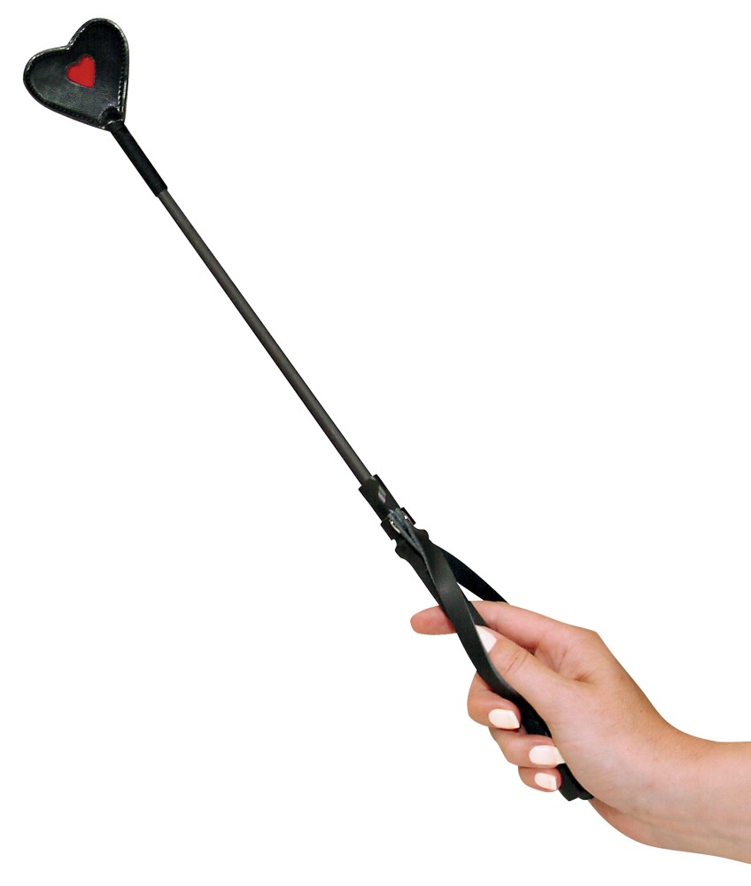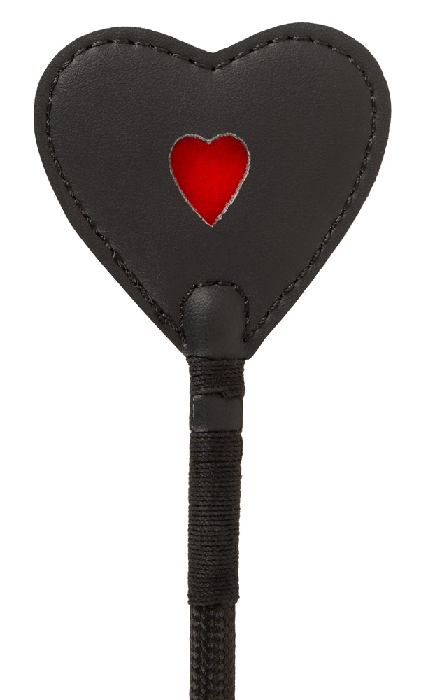 Černočervený crop od Bad Kitty se špičkou ve tvaru srdce, plastovou tyčí a rukojetí, která je dodávána s ramínkem. Délka cca 45 cm.