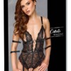 Body bez rukávů a rozkroku od Cottelli BONDAGE s odnímatelným páskem. Vyrobeno z hladkého a pružného černého matného materiálu s krajkovou výzdobou kolem paží a nohou. Se stříbrnými doplňky. Má velký stojáček s kroužkem vpředu. Body má také svůdné otevřené košíčky (výřezy) a odnímatelný, stimulující řetízek přes otevřenou oblast rozkroku. S dlouhým, pečlivě integrovaným oboucestným zipem vzadu. Součástí balení jsou pásky na ruce s karabinkami a řetízky, které lze zavěsit na kroužky na pásku. Pásek a měkké pásky lze rychle nasadit a sundat díky nastavitelným suchým zipům.