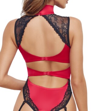 Senzační body podvazkového systému Cottelli LINGERIE vyrobené z elegantního červeného saténu s vsadkami z jemné černé krajky. Měkké a pružné po celém obvodu pro maximální pohodlí. Sofistikovaný střih s knoflíkovým saténovým límečkem, krajkou zakrývající ramena a krásným odhalujícím dekoltem. Se dvěma nastavitelnými háčky na téměř otevřených zádech. Dva pružné popruhy procházejí otevřeným rozkrokem. Popruhy podvazkového systému lze nastavit a jsou také zcela odnímatelné.