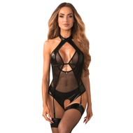 Černé body Dominna od Obsessive bez rozkroku má podvazková ramínka a je vyrobeno ze stylové kombinace měkké, jemné síťoviny a krásného wet looku. Pod extravagantním výstřihem se nachází malý ozdobný detail. Body má vzrušující design bez ramínek a zad – má pouze módní ramínko s elegantní sponou. 2 podvazková ramínka vpředu lze upravit. Pružná ramínka v rozkroku a hýždích lze také upravit.