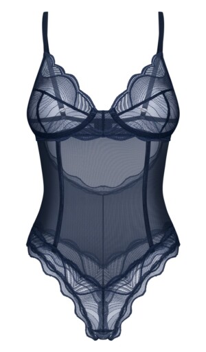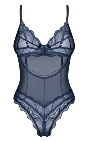 Průhledné body bez rozkroku Nightly Blue od Obsessive je v elegantní modro-modré barvě. Je měkké a pružné s jemným krajkovým vzhledem. Má také košíčky bez kostic pro krásný výstřih. Ramínka a suchý zip přes odhalená záda lze nastavit dle potřeby.