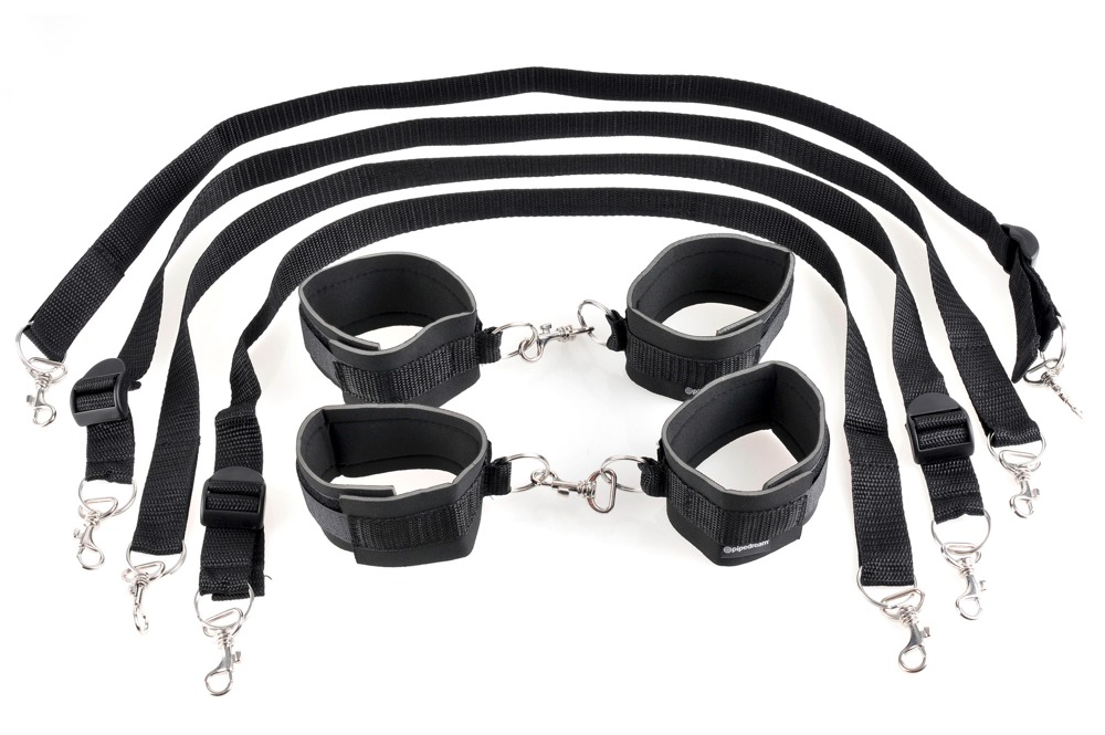S touto sadou pro spoutání postele je možná téměř jakákoli fantazie o bondage. Pouta a kotníky lze upevnit suchým zipem a k sobě připevnit. Součástí sady jsou popruhy s karabinkami, které lze připevnit například k sloupkům postele, a tak je upevnit na horní a dolní část těla. Pouta jsou odolná proti roztržení, což zaručuje bezpečnou zábavu.