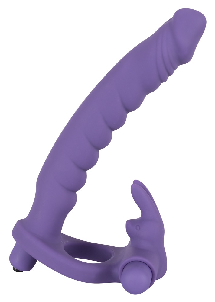 Strap-on dildo s vibracemi pro NĚJ a erekčním kroužkem včetně klitorálního stimulátoru ve tvaru králíka s odnímatelným mini vibrátorem.