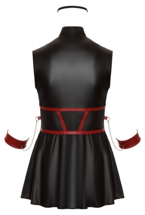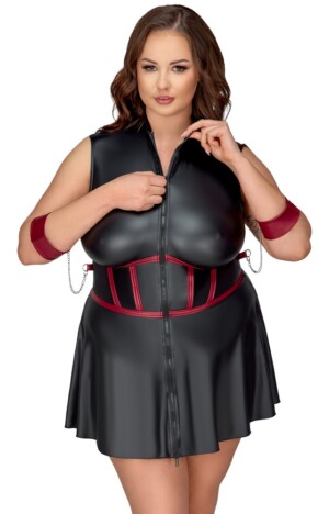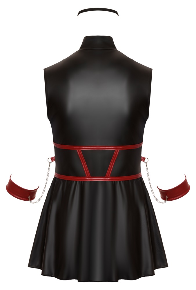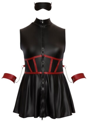 Krátké šaty bez rukávů od Cottelli BONDAGE PLUS v přiléhavém střihu s rozšířenou sukní. Šaty jsou zcela pružné a mají elegantní černý matný vzhled s červenými kontrastními pruhy, které zvýrazňují pas. Na každé straně je kroužek pro dvě měkké pouta na ruce s karabinkami. Manžety jsou nastavitelné suchým zipem. Přední strana s oboucestným zipem po celé délce, který lze otevřít od stojáčku a švu. Součástí je také lehce polstrovaná maska na oči, která je zcela neprůhledná pro vzrušující hru.