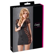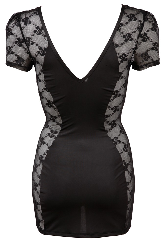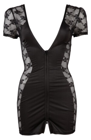 Průhledné, přiléhavé šaty s jemnou krajkou po stranách. S krátkými rukávy. Velmi hluboký výstřih vpředu i vzadu. Dvoucestný zip vpředu dodává tomuto sexy vzhledu dokonalý nádech.