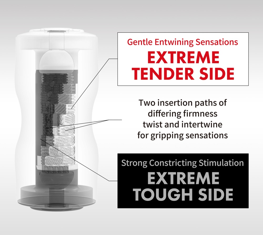 Lze použít oba konce masturbátoru Dual Sensation Cup Extremes od TENGA. Dodává se v diskrétním kalíšku s působivě texturovanými kanálky, které se kroutí a proplétají pro jedinečné a intenzivní pocity. Extrémně citlivá strana (bílá) stimuluje jemně a měkce, zatímco extrémně odolná strana (černá) stimuluje silně a úchvatně.