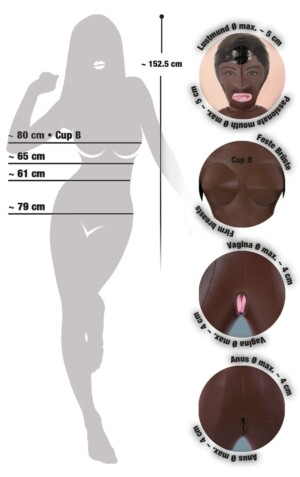 Tato krásná žena má 3 lákavé a těsné otvory pro potěšení. Její obličej a vlasy jsou potištěny. Stojí s pokrčenýma rukama připravenými k objetí.