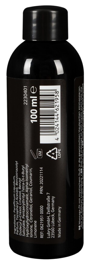 Pro příjemné partnerské masáže! Erotický masážní olej se stimulující mystickou vůní jako z Tisíce a jedné noci. Vysoce kvalitní ingredience zanechávají pokožku sametově hebkou a hladkou pro dlouhotrvající příjemné masáže. Erotická vůně probouzí sexuální chuť na vášnivou Kámasútru a tantrický sex. Je rozpustný ve vodě a lze jej smýt.