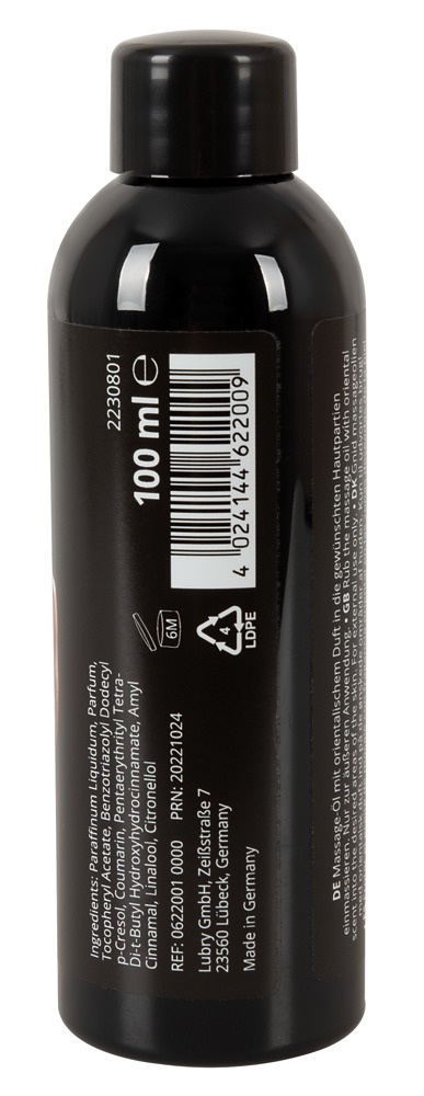 Vysoce kvalitní erotický masážní olej pro dlouhotrvající lubrikaci. S originální orientální vůní, která pomáhá lidem zbavit se zábran. Vyrobeno v Německu.