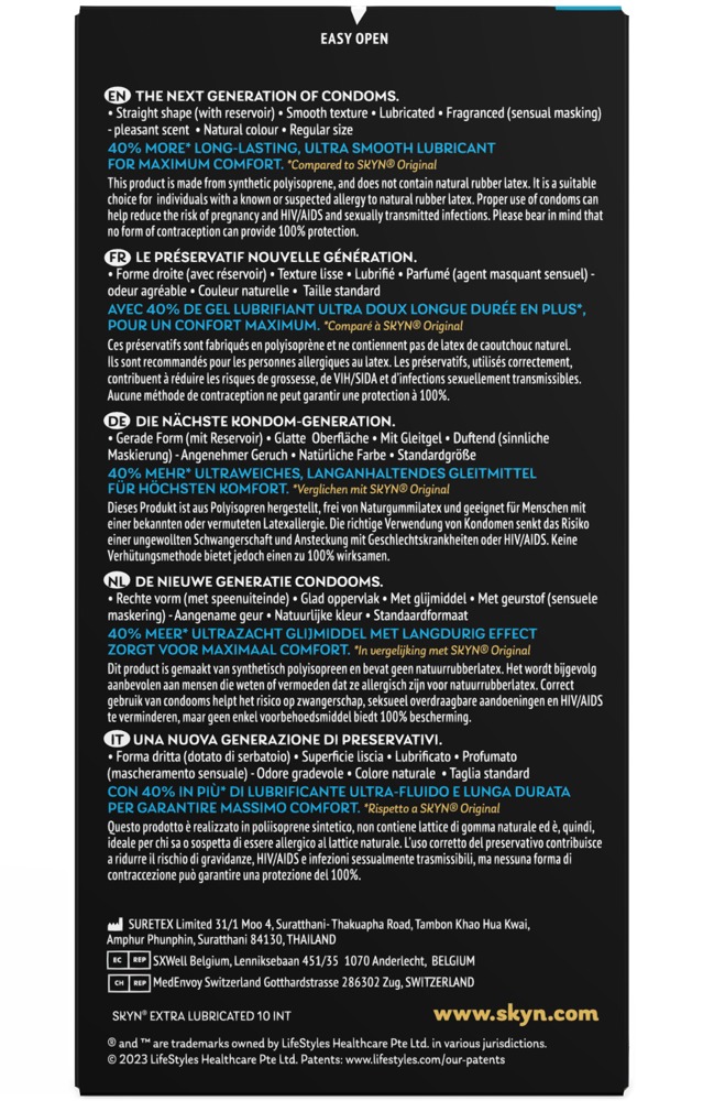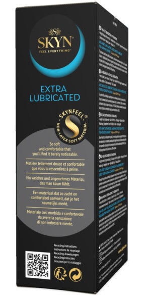 Průhledný, ultratenký, veganský kondom Manix Skyn Extra Lubricated s lubrikačním povlakem na bázi silikonu. Polyisoprenový materiál kondomů se nazývá Skynfeel a je měkčí a pružnější než latex, ale stejně stabilní a bez klasického latexového zápachu. Je proto ideální pro osoby alergické na latex.