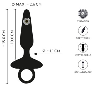 Štíhlý, kuželovitý kolík se zavádí jemně a snadno. Sametově měkký silikon zajišťuje příjemné klouzavé zasunutí. Silikonový kolík se díky své flexibilitě dokonale přizpůsobí tělu a jeho pohybům. Široká zarážka s praktickým kroužkem zajišťuje bezpečnou hru, aniž by se příliš zasunul. Díky kroužku se také velmi snadno vyjímá.