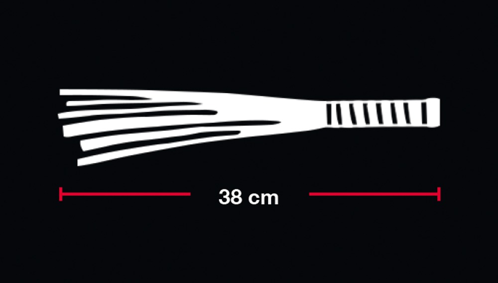 Malý červenočerný šlehač s mnoha měkkými listy a rukojetí potaženou látkou. Materiál je k dispozici ve dvou různých barvách.