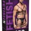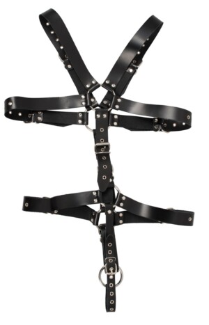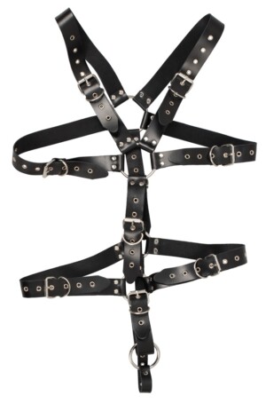 Postroj vyrobený z černých, cvočkových kožených pásků a ocelových spojovacích kroužků. Lze jej nastavit pomocí přezek. Kroužek na penis/varle (Ø 5 cm) ho udrží pod kontrolou. Vysoce kvalitní, odolná kvalita.