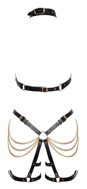 Dvoudílná sada postrojů od ZADO s topem s ramínky a jocksy s pásky na stehnech. Oba díly jsou vyrobeny z černých kožených pásků s opulentními zlatými řetízky a ozdobnými cvočky, kroužky a přezkami. Nastavitelné pro perfektní padnutí.