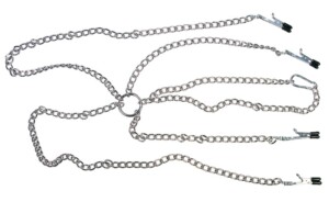 Náhrdelník, 2 řetízky s úchyty na bradavky (celková délka 25 cm každý) a 2 řetízky s intimními úchyty (celková délka 60 cm každý) jsou připevněny k náprsnímu kroužku (Ø 3,5 cm). Délka náhrdelníku je nastavitelná karabinou.