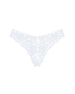 Bílá tanga Heavenlly od Obsessive vyrobená z jemného strečového tylu. Svůdně bílá s krásnou květinovou krajkou. Brazilský V-střih s malým šperkem v přední části pasu.