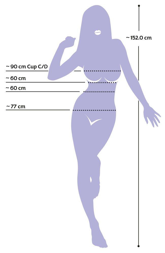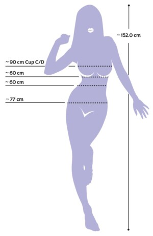 Velikost (obvod): prsa 90 cm, pas 60 cm, boky 77 cm. Hloubka zasunutí do úst 9 cm, Ø 4 cm.