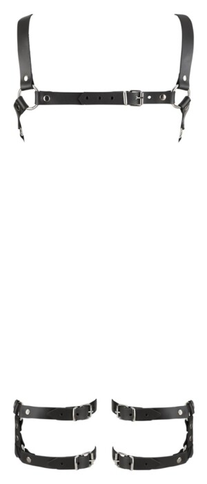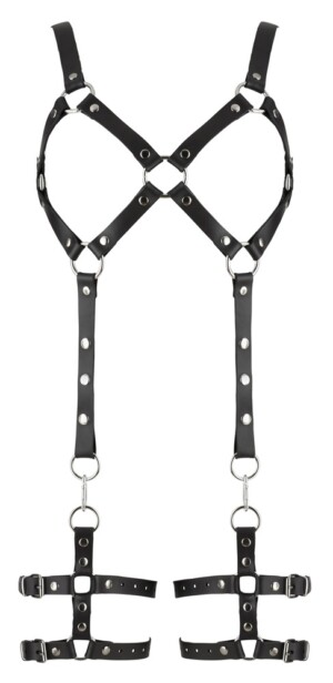 Hrudní postroj s odnímatelnými stehenními popruhy, které lze snadno rozepnout pomocí karabinek.