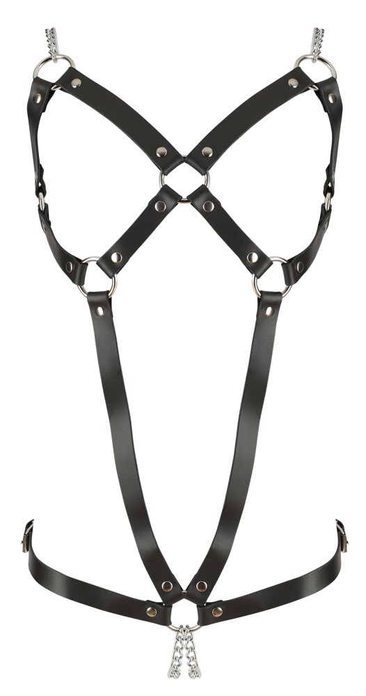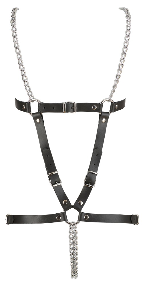 Dokonalý postroj pro fanoušky fetišů! Kožené pásky v kombinaci s ocelovými kroužky, kovovými ramínky na podprsenku a dvěma kovovými řetízky, které vedou přes jinak otevřenou oblast rozkroku. Všechny pásky jsou nastavitelné pro perfektní padnutí.