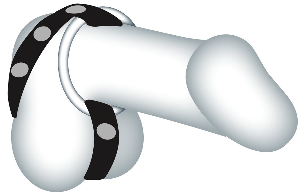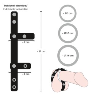 Černý, vysoce kvalitní pásek z imitace kůže na penis/varlata se 3 vyměnitelnými kovovými erekčními kroužky: Ø 3 cm, Ø 3,5 cm a cca Ø 3,8 cm. Průměr koženého pásku lze dvakrát nastavit. Erekční kroužky lze snadno vyměnit díky drukům.