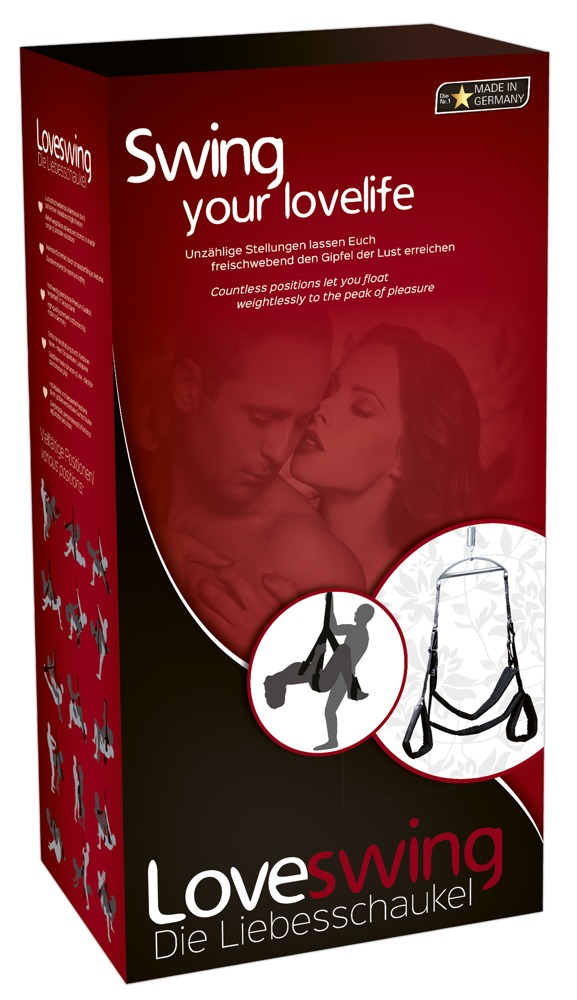 Užijte si zcela nové dimenze lásky – houpačka lásky umožňuje nespočet poloh. Budete nadšeni. Houpačka lásky s širokými, lehce nastavitelnými popruhy. Dodává se se speciální pružinou. Maximální nosnost 150 kg. Součástí je návod k použití a tipy pro polohy. Popruhy: 100% polyester, výplň: 100% polypropylen, pěna: PE pěna, potahová lišta: bavlna. Jezdec: kov s lesklým niklem, háček: 100% polyamid, D-kroužek: železo, karabina: kov (pozinkovaná), řetízek a pružina: kov (pozinkované). Podložka: ocel (pozinkovaná), matice: celokovová.