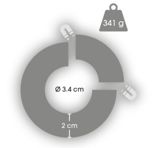 Stříbrný erekční kroužek/natahovač varlat vyrobený z nerezové oceli. S magnetickým dílem pro otevírání a zavírání kroužku. Vnitřní Ø: 34 mm. Vnější Ø: 63 mm. Tloušťka: 20 mm. Hmotnost: 341 g. Kov.