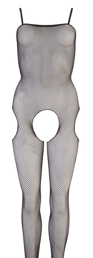Síťovaný kombinéz z černé strečové síťoviny. Zde nic není ponecháno fantazii. Provokativně bez rozkroku a s velkými bočními průzory. Úzká ramínka. S částí pro nohy. 100% polyamid.