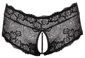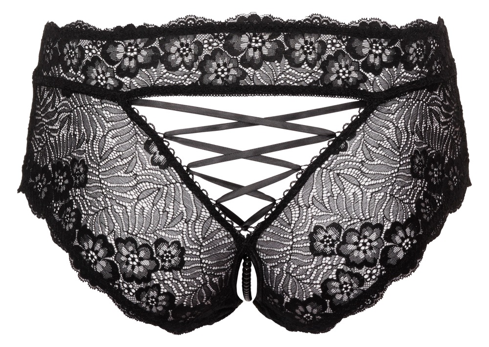 Černé kalhotky bez rozkroku od Cottelli CURVES vyrobené výhradně z jemné květinové krajky. Měkké a pružné pro perfektní padnutí a vysoké pohodlí. Obzvláště důmyslný je elastický a stimulující perlový řetízek v otevřeném rozkroku a saténové šněrování v trojúhelníkovém výřezu ve spodní části.