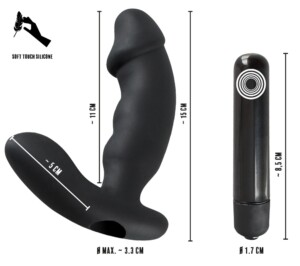 Tento černý vibrátor s mírně zvlněnou tyčí a velkým žaludem na špičce má drzý bonus: další stimulátor hráze. Celková délka 15 cm, Ø 2,7 až 3,3 cm. Stimulátor hráze 5 cm dlouhý, Ø 2,5 cm. Silikon s PU povlakem, ABS. Baterie objednávejte zvlášť: 1 x AAA.