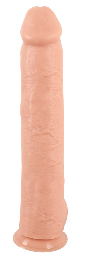 Extra velké realistické dildo s vypouklým žaludem a výraznými žilami pro obzvláště intenzivní pocity rozkoše. S varlaty a silnou přísavkou pro zábavu bez použití rukou.