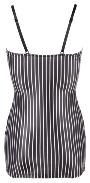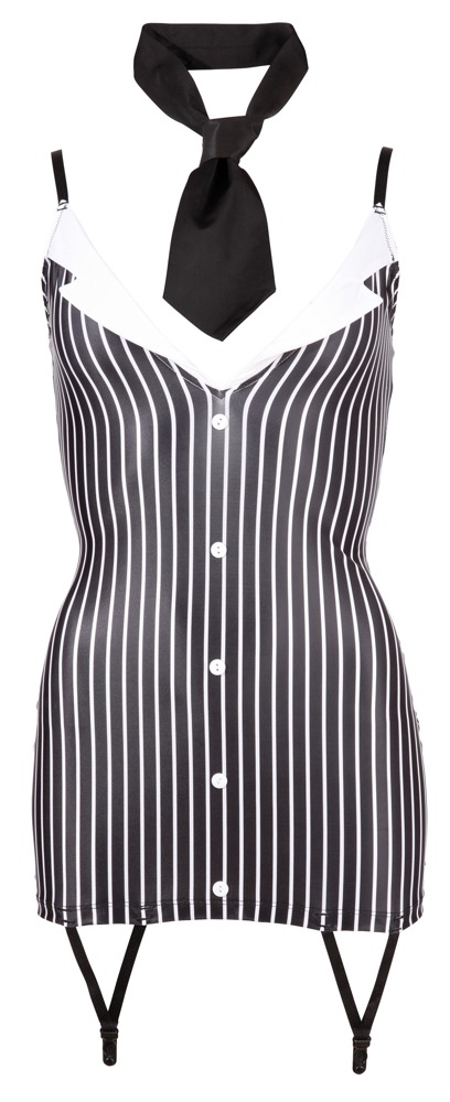 Přiléhavé šaty s nastavitelnými ramínky a dvěma kšandami vpředu. Ozdobné knoflíky vpředu a lehký límeček kolem hlubokého výstřihu. Kravata je součástí balení.